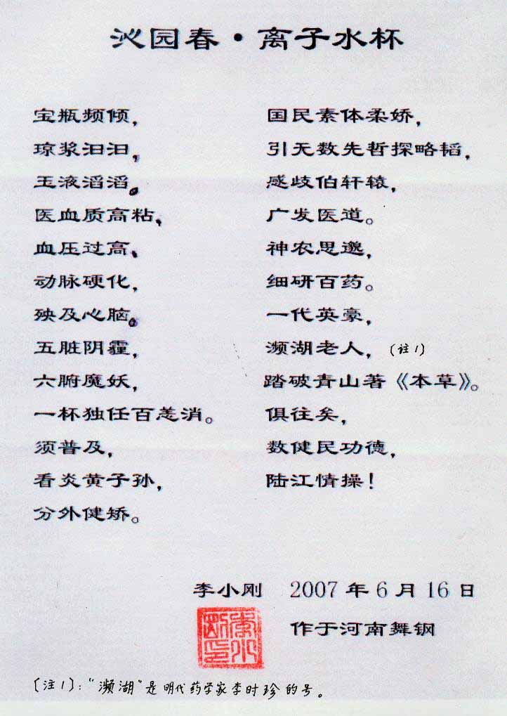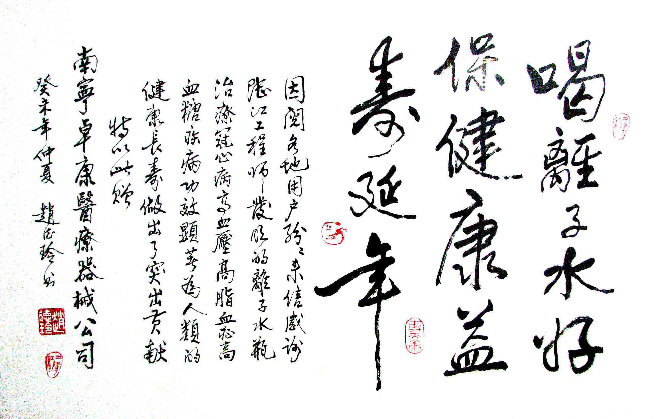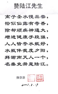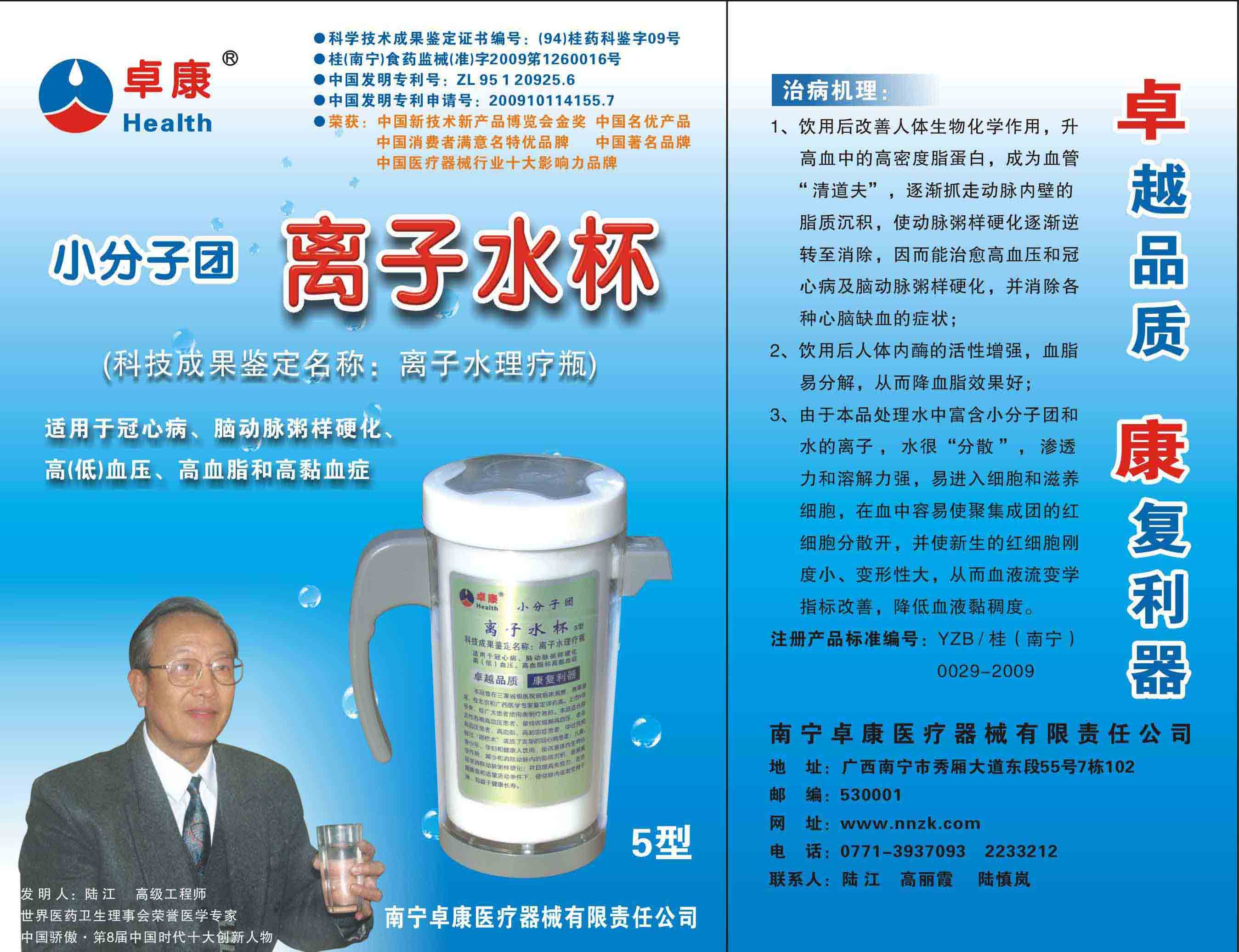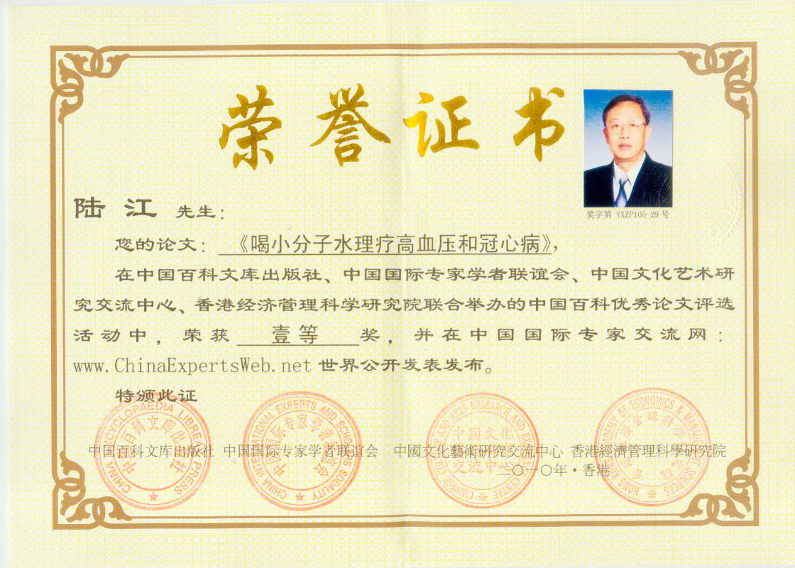 -----我是從事建筑的高工,本來沒有資格去攻克醫(yī)學(xué)難題,卻為了自身健康才扣響醫(yī)學(xué)的大門。由于我1990年患高血壓,因怕中風(fēng)才研究發(fā)明了離子水瓶,我把水處理成微小分子團(tuán)水,飲用后治愈了高血壓。便于1993年底送到三家省級(jí)醫(yī)院做臨床試用4個(gè)月。經(jīng)北京和廣西醫(yī)學(xué)專家鑒定:"降脂降壓效果好"," 能擴(kuò)大心腦動(dòng)脈流量,改善心腦電圖以及微循環(huán)","對(duì)治療心腦動(dòng)脈粥樣硬化、高血壓、高血脂有良好的醫(yī)療保健作用。""產(chǎn)品的技術(shù)性能和療效達(dá)到了同類產(chǎn)品的國(guó)內(nèi)領(lǐng)先水平,經(jīng)廣西醫(yī)學(xué)科學(xué)情報(bào)研究所檢索,未見國(guó)外有類似報(bào)道。"中國(guó)醫(yī)學(xué)科學(xué)院張正國(guó)教授從美國(guó)國(guó)立醫(yī)學(xué)圖書館數(shù)據(jù)庫(kù)存Medline檢索英俄文資料,均未見類似報(bào)告。2000年上市后,我為了對(duì)消費(fèi)者負(fù)責(zé)而繼續(xù)觀察研究,一直通過《信譽(yù)卡》和《質(zhì)量跟蹤調(diào)查書》向患者承諾療效,請(qǐng)用戶使用6個(gè)月后反饋效果。和脂壓患者飲用2至5個(gè)月內(nèi),消除癥狀,停服藥物,血壓正常;冠心病患者飲用3~5個(gè)月逐漸減輕至消除心絞痛、房顫等癥狀,不再服藥,飲用1年左右心電圖正常,經(jīng)冠脈造影掃描無明顯狹窄,表明冠心病痊愈。大量患者還反映許多衰弱器官被修復(fù),讓前列腺增生、慢性咽喉炎、慢性氣管炎、支氣管炎、慢性胃炎、腸炎和膽囊炎等不藥而愈;2型糖尿病患者是因?yàn)橐葝u衰弱致病,飲用該水半年至一年,逐漸減藥至停藥,血糖尿糖正常,真正治愈2型糖尿病。中風(fēng)后遺癥患者飲用六七個(gè)月,可逐漸減輕至消除肢體和語(yǔ)言障礙,表明飲用該水能讓壽命很長(zhǎng)的神經(jīng)元細(xì)胞逐漸修復(fù),奇跡般地恢復(fù)肢體和語(yǔ)言功能。飲用后還使胸腺和脾臟兩個(gè)重要的免疫器官被修復(fù)和增強(qiáng),產(chǎn)生免疫細(xì)胞多,提高了免疫力,使人不生病或少生病。自此, 飲用微小分子團(tuán)水創(chuàng)造了攻克冠心病、高(低)血壓和糖尿病三大醫(yī)學(xué)難題的奇跡。人們對(duì)此感到不可思議,但實(shí)踐是檢驗(yàn)真理的唯一標(biāo)準(zhǔn)。